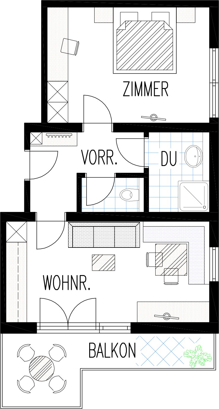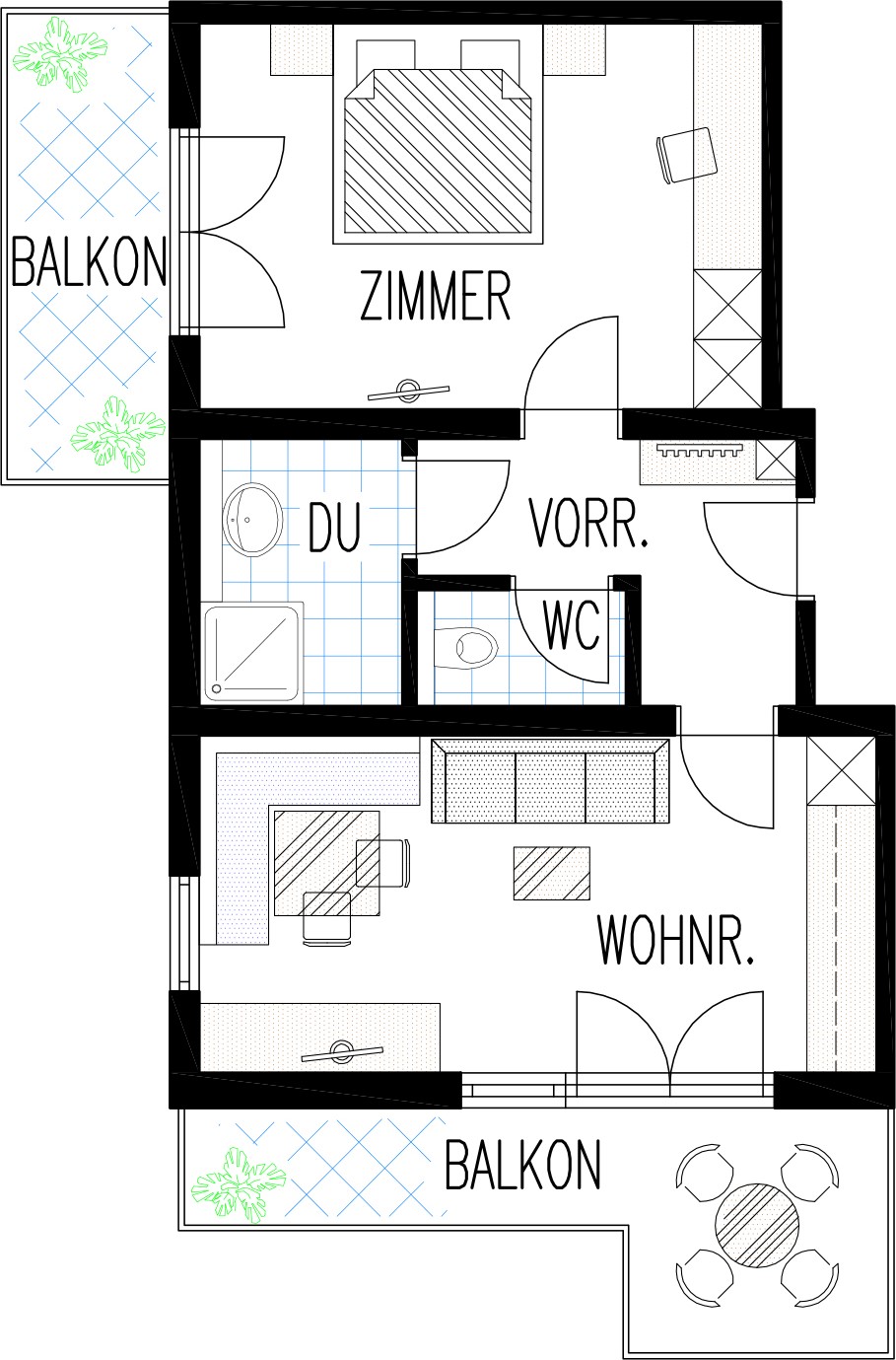 Unser modernes Appartement 01 bietet auf 45 m² großzügigen Platz für 2–3 Personen.Ein separates Schlafzimmer, ein Wohnraum mit ausziehbarer Doppelcouch sowie ein Badezimmer mit getrenntem WC sorgen für angenehme Privatsphäre.